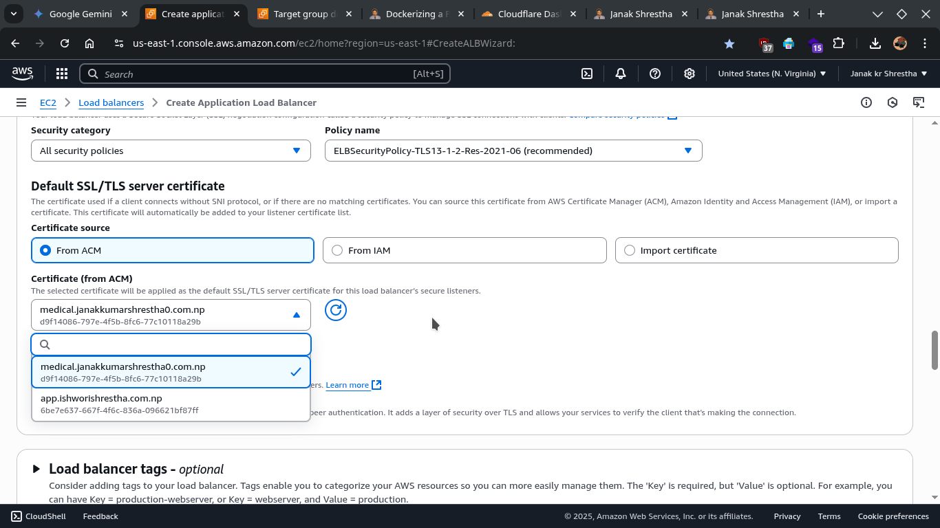 medical.janakkumarshrestha0.com.npin AWS Certificate Manager (ACM), click “Request a new ACM certificate” and follow the prompts to create a new Public Certificate. This usually involves DNS validation (adding a CNAME record to your DNS). Follow this guide: Request a new ACM certificate - Once the certificate is issued in ACM or already have it, refresh and select it from the dropdown.
