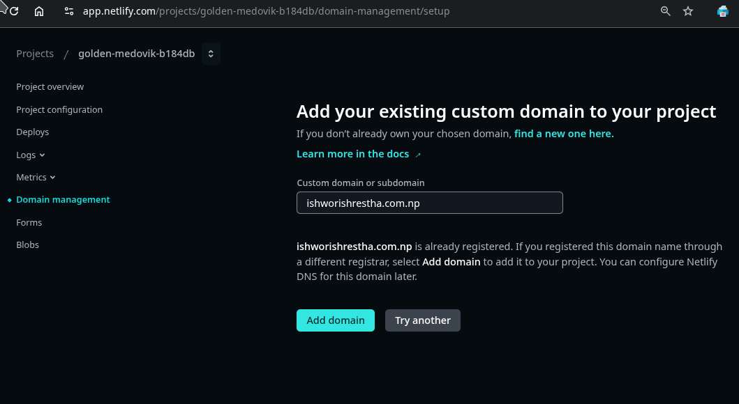 Netlify needs to verify that you own the domain ishworishrestha.com.np before it allows you to add a subdomain like ai.ishworishrestha.com.np.