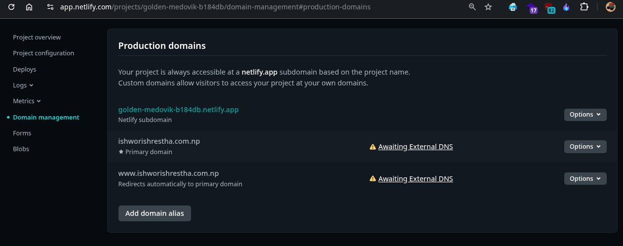 Awaiting External DNSand note a value likeishworishrestha.com.np ALIAS apex-loadbalancer.netlify.comandwww CNAME golden-medovik-b184db.netlify.app.