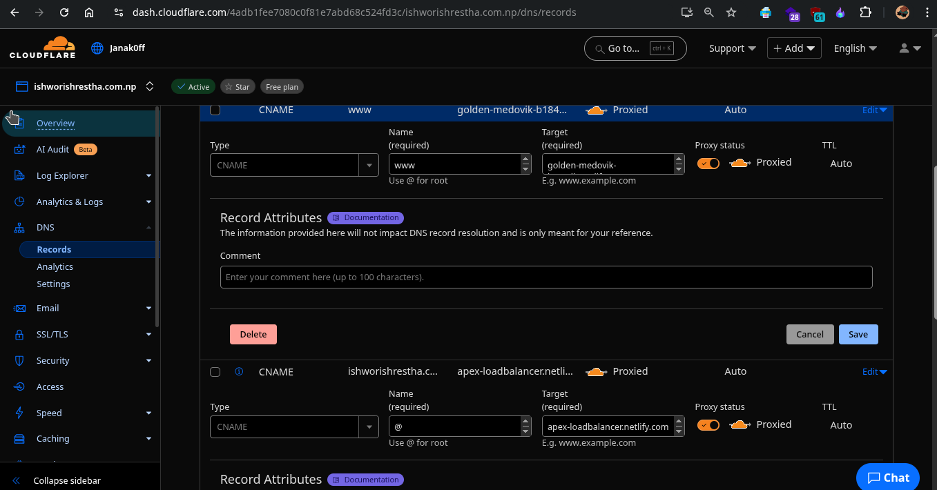 Arecords for your root domain (likeishworishrestha.com.nppointing to an IP address) from previous attempts, delete them now. The CNAME toapex-loadbalancer.netlify.comreplaces that.