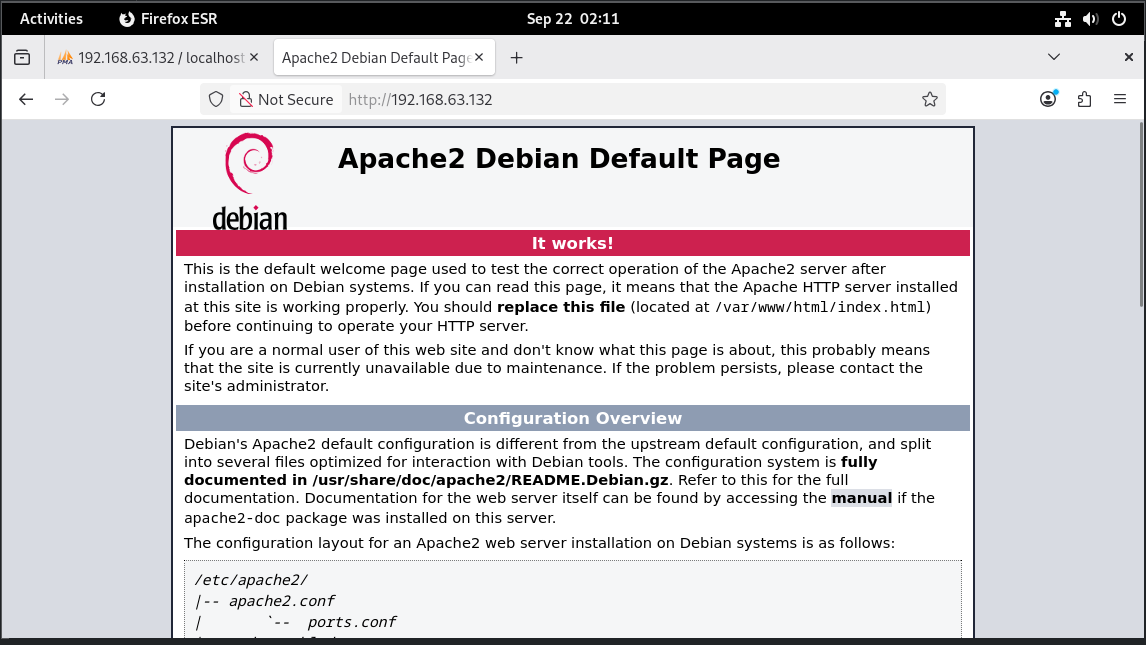 Test: Open http://192.168.63.132 in a browser. You should see the Apache default page.