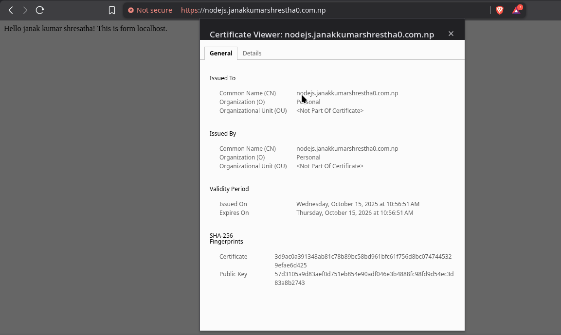 127.0.0.1 nodejs.janakkumarshrestha0.com.npto/etc/hosts. - Configure Nginx (or Apache) to listen on HTTPS