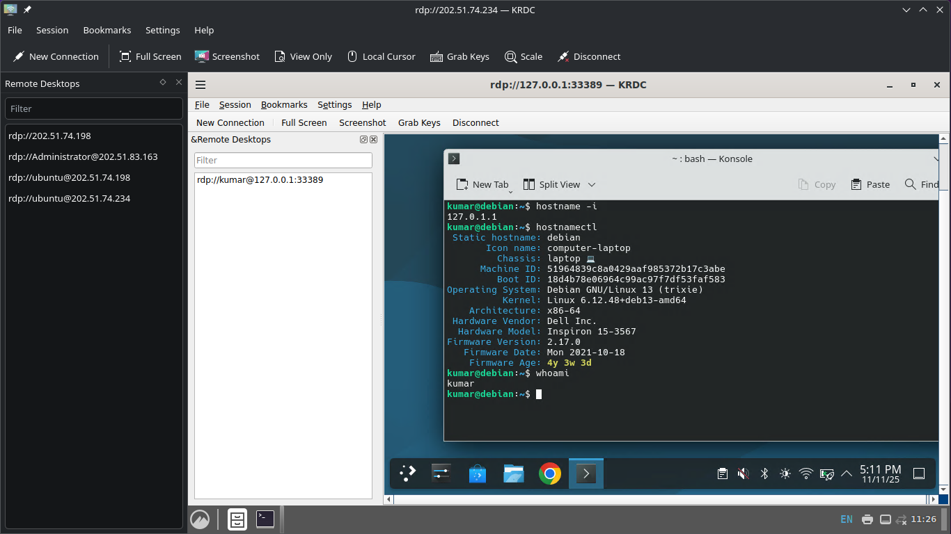 sshd(Port 22),xrdp(Port 3389, andlocalhost:3000(NodeJS app) configured for KDE Plasma). - Tunnel Daemon: