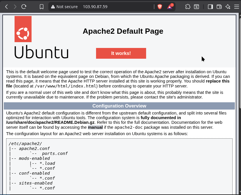 Test the Web Server: After these steps, you should be able to access the default Apache “It works!” page using your VM’s public IP address (103.90.87.59) in a web browser.