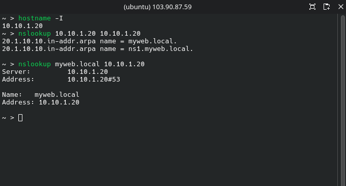 nslookup 10.10.1.20 10.10.1.20 | Reverse Lookup Test. | Resolves 10.10.1.20 to myweb.local. |