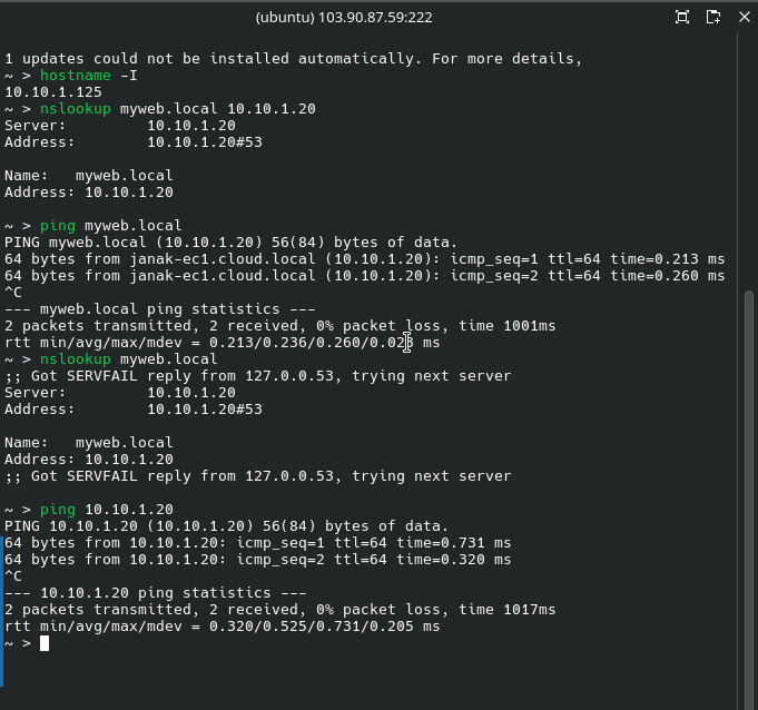 | Client Outside VPC | nslookup myweb.local 103.90.87.59 | Public IP (103.90.87.59) | Queries the public address, relying on your VPC’s Port Forwarding to reach the DNS server. |