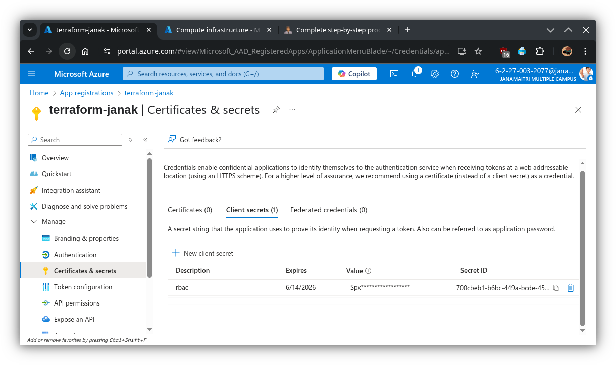 azure_subscription_id = "bf97eca7-bcbd-41ce-bc31-9c5d6fds84f2073" #subscription id azure_client_id = "2c6e5db5-620e-4b07-8b9a-904sfs45f297d41" #app registration azure_tenant_id = "69c13822-3598-4d4d-aae2-f142dsfs0ad786ab" #tenant id azure_client_secret = "UbB8Q~3GxAWrF67k1LdsdfvUzk72b2DBV~rgTkAkOaad" #secret value