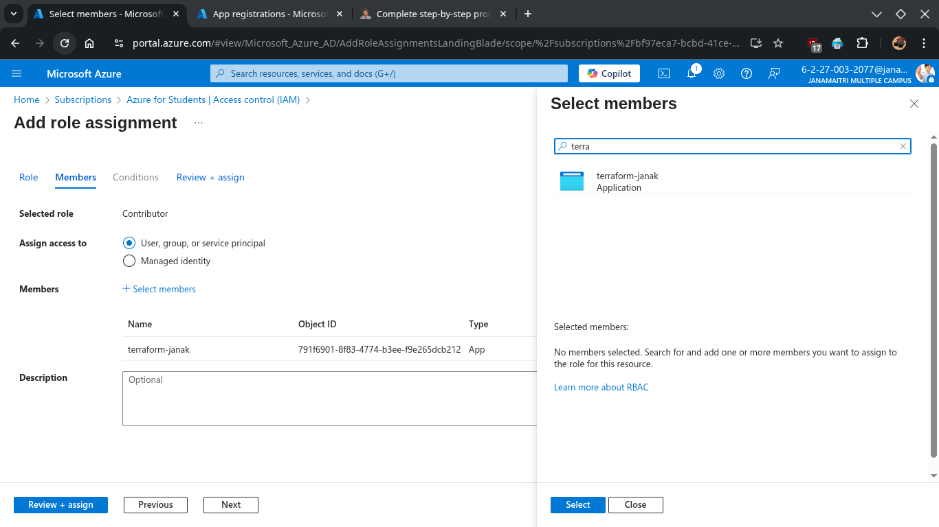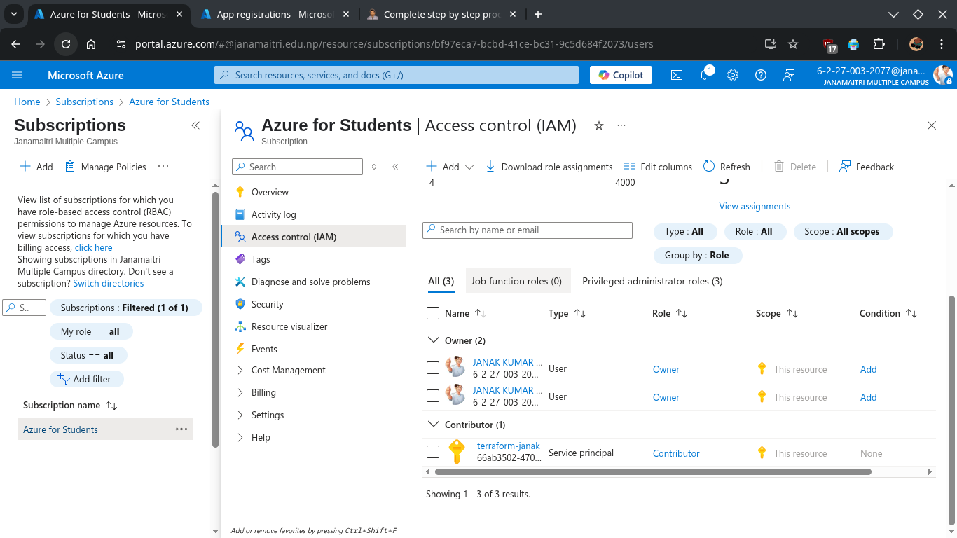 az ad sp create-for-rbac --name terraform-janak --role="Contributor" --scopes="/subscriptions/<subscription-id>"